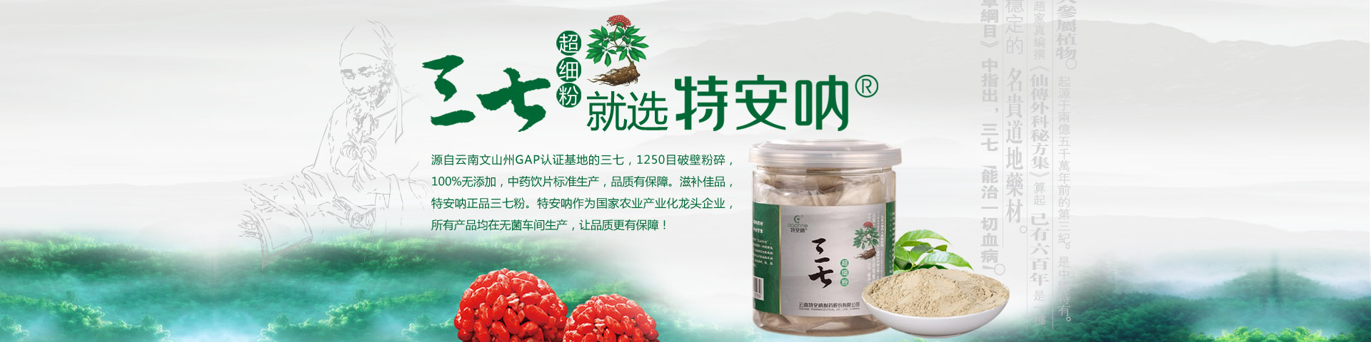 云南特安吶制藥股份有限公司(以下簡稱“公司”)成立于1994年5月。2015年7月,云南省康旅控股集團(tuán)有限公司旗下的云南三七科技有限公司増資擴(kuò)股,公司成為立足文山、專注三七開發(fā)的國有控股企業(yè)。公司成立以來,緊緊依托文山得天獨(dú)厚的三七資源優(yōu)勢,全力打造三七產(chǎn)業(yè)。經(jīng)過近30年的發(fā)展,公司構(gòu)建了以“產(chǎn)品研發(fā)基地、三七GAP種植基地、中藥材加工基地、產(chǎn)品生產(chǎn)基地、物流倉儲(chǔ)基地”和“三七國際交易...