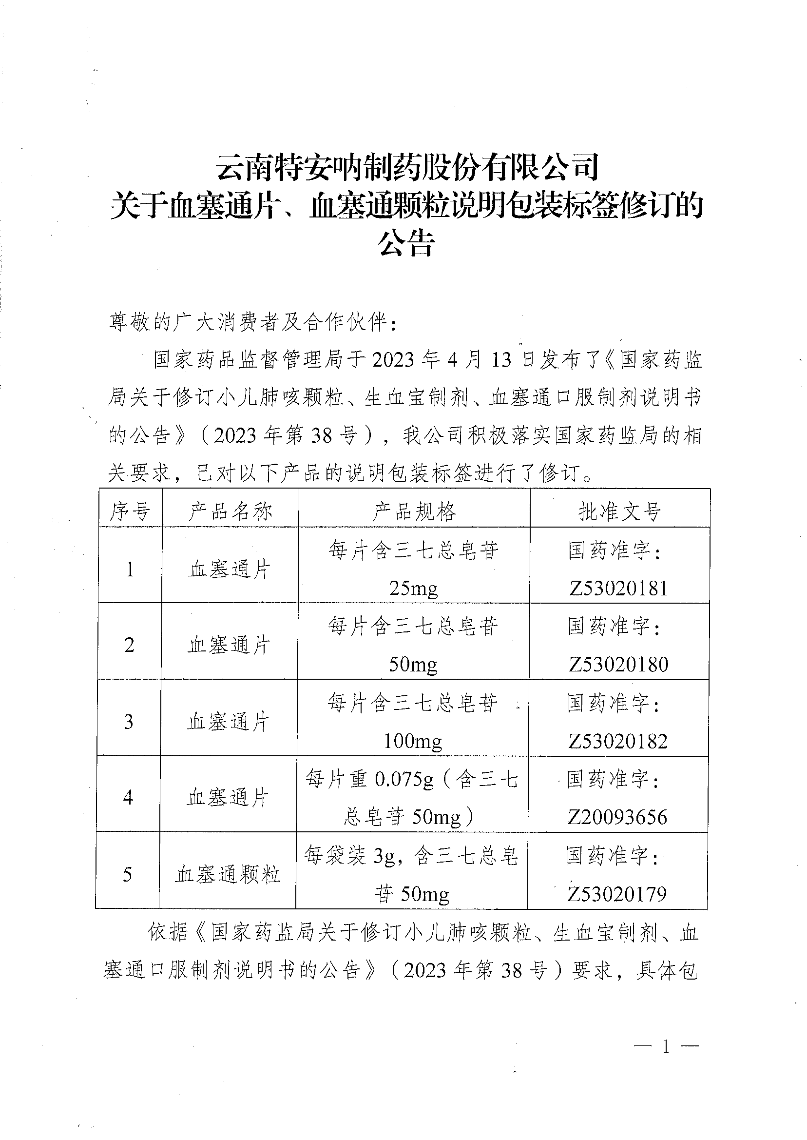 云南特安吶制藥股份有限公司 關于血塞通片、血塞通顆粒說明包裝標簽修訂的公告